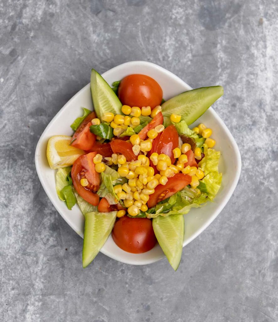 Taptaze domates, salatalık, biber ve soğanın zeytinyağı ve limon sosuyla harmanlandığı, hafif ve doyurucu salatanın büyük boy porsiyonu.
